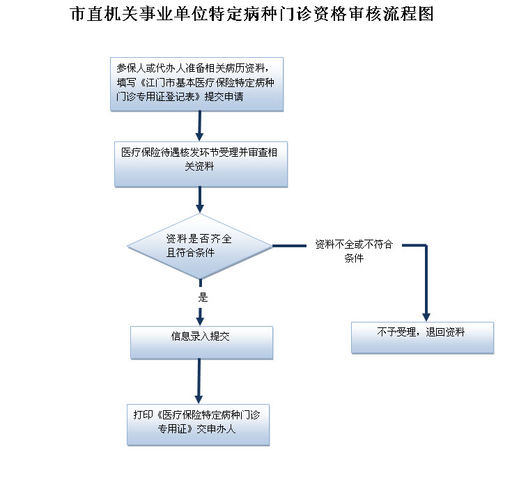 1、申请、新增:必须到二级以上(含二级)医疗机构(肺结核活动期间和精神病可到专科医院)填写《江门市基本医疗保险特定病种门诊专用证登记表》并经医务科(医教科)确认盖章后,凭二级以上(含二级)医疗机构出具相关病种的病历资料或出院小结、检查报告结果原件及复印件、疾病诊断证明原件以及近期1寸 免冠照片一张,到社会保险经办机构办理登记审核手续。