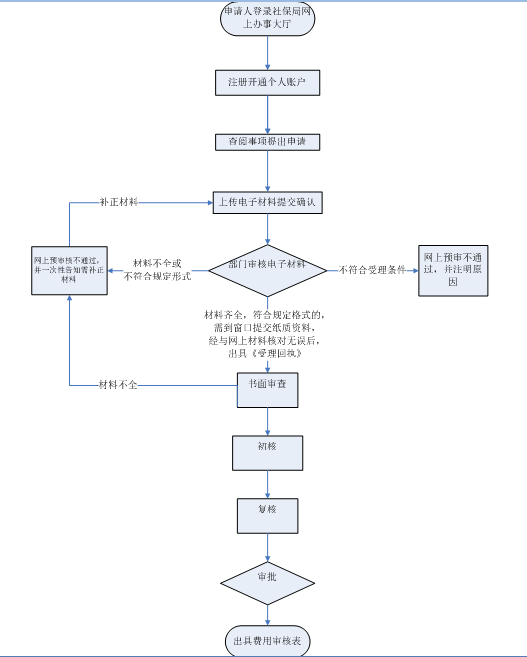 3、受理。市社保医疗保险待遇科收到网上申请后对电子材料进行预审核,符合申请资格,并材料齐全、符合规定格式的1个工作日内在网上预审核通过,不符合受理条件的,1个工作日内在网上预审核不通过,并一次性告知申请人需补正的材料。预审核通过的须到市社保医疗保险待遇科窗口提交纸质材料才予正式受理。