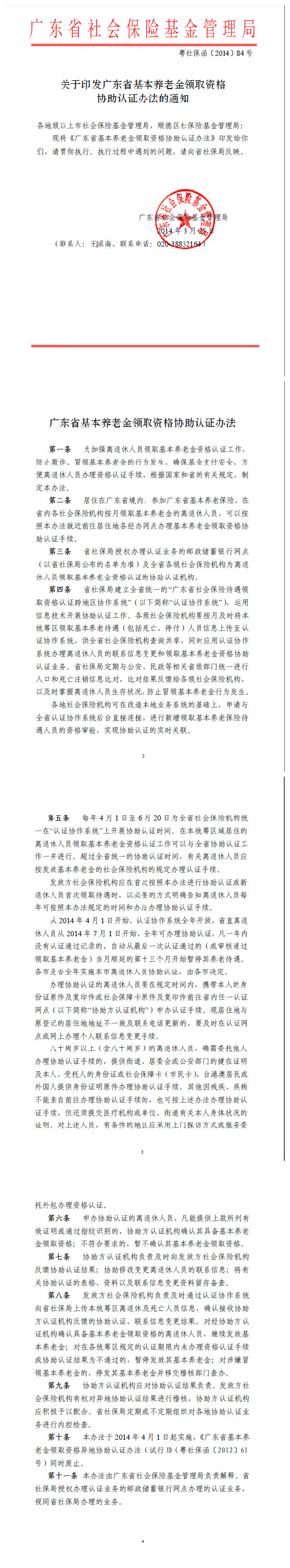 关于印发广东省基本养老金领取资格协助认证办法的通知